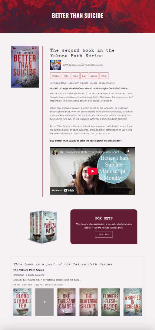 You can view the Amy Tasukada author website for yourself, or view the images below. Although, it being a website, the full experience is optimal.